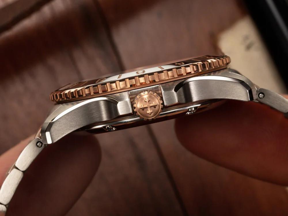 • Su caja de 39 mm en acero inoxidable 316L con tratamiento IP en oro rosa 5N ofrece proporciones refinadas y una presencia elegante en la muñeca, combinando estética clásica y resistencia para el uso diario.