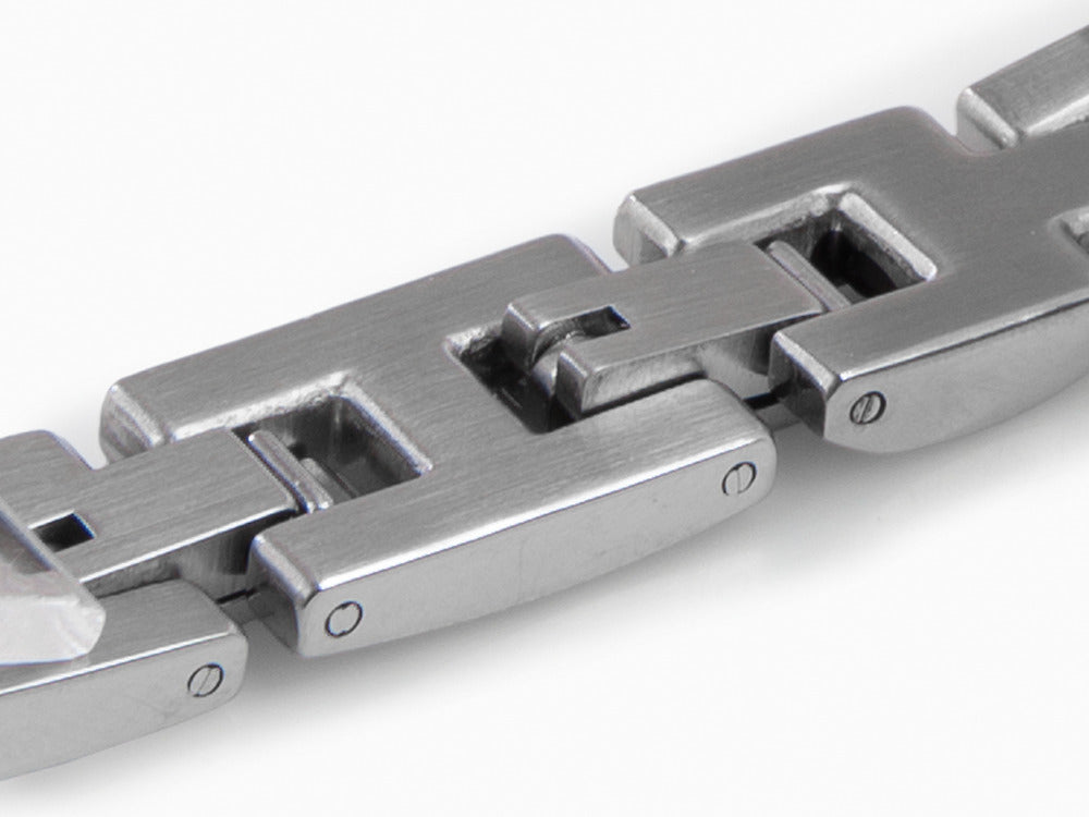 • Las geometrías refinadas cuentan con un diseño moderno, el icono absoluto de las colecciones de pulseras Maserati.