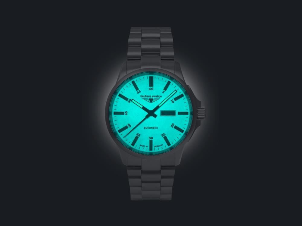• El Reloj Bauhaus Aviator, con una esfera beige luminiscente está equipado con un movimiento automático japonés Citizen Miyota 8205 de 21 rubíes y protegido por un cristal de zafiro. Este reloj de piloto clásico y analógico se presenta en una elegante caja de titanio y tiene indicado de día y mes.