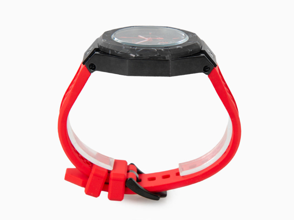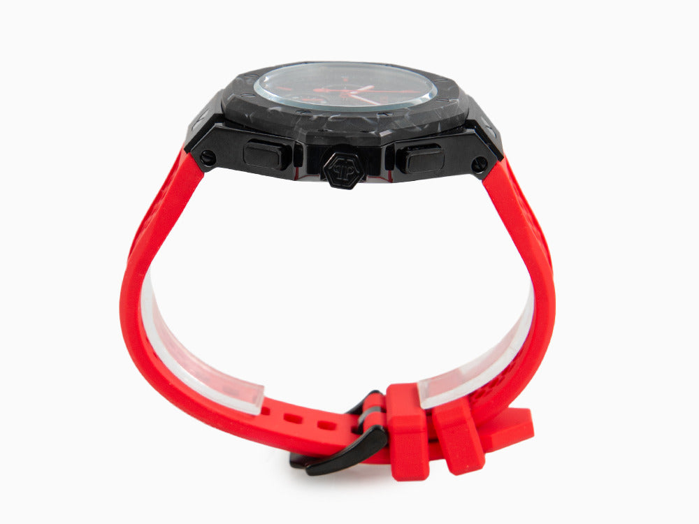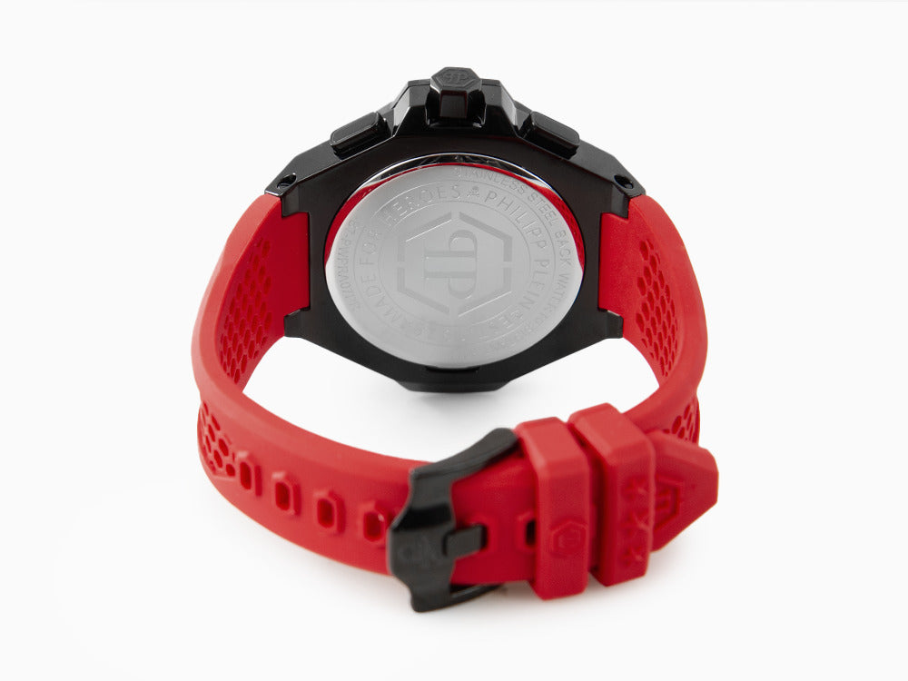• La colección Chrono Royal de Philipp Plein se caracteriza por una esfera de 46 de mm en negro, con una caja negra, tres subesferas y una correa de silicona roja. El patrón hexagonal de la esfera y los tornillos hexagonales simbolizan el icóno de la marca.