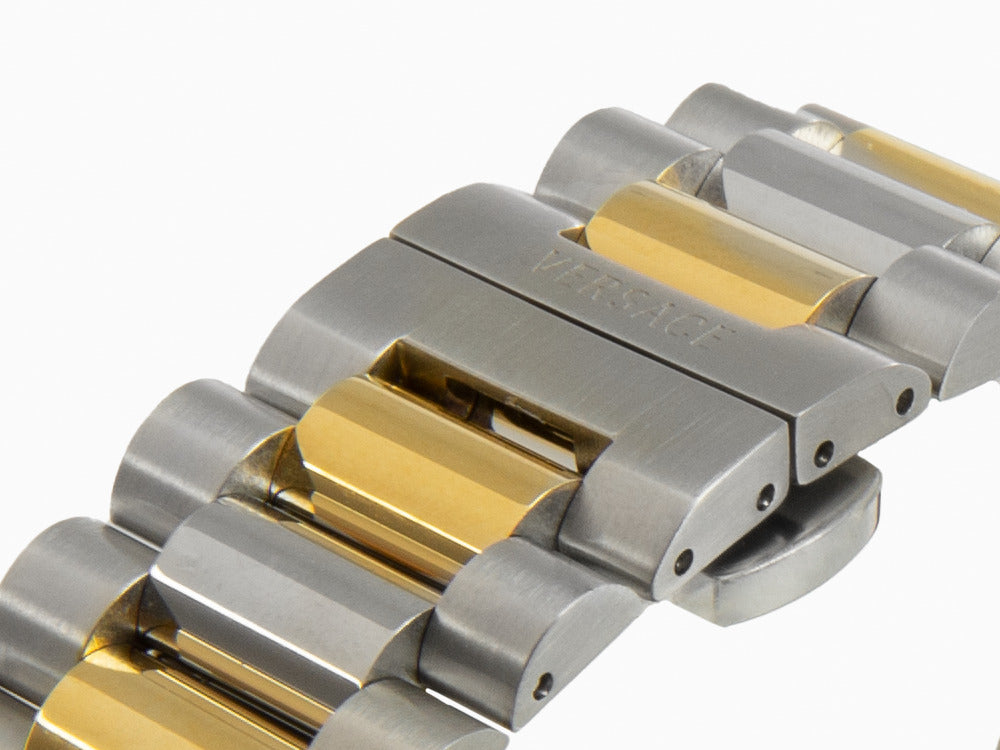 • El reloj Versace V Dome presenta una esfera blanca guilloché cubierto por cristal de zafiro. El detalle de la corona dorada, el bisel en dorado y la medusa dentor de la caja en 3D van a juego con el brazalete de acero bicolor y lo convierten en un clásico de la marca.