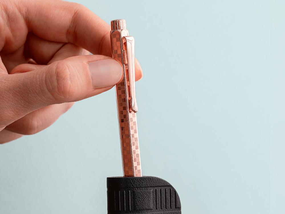 • El Caran d’Ache Ecridor Damier Rose Gold incluye un bolígrafo de diseño suizo con cuerpo hexagonal de latón, acabado en oro rosa y grabado guilloché damier, acompañado de un elegante estuche de piel negra. Ofrece escritura suave y precisa, ideal como accesorio profesional o regalo exclusivo.