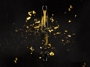 • En el antiguo mito japonés, se decía que el gallo había tentado a la diosa del sol, Amaterasu, fuera de su caverna, devolviendo la luz al cielo después de un período de oscuridad absoluta. En reconocimiento a la valentía del gallo durante este tiempo de desesperación, este pájaro japonés es un símbolo de valentía en todo Japón. Esta estilográfica presenta un plumín bicolor de 18k y detalles chapados en oro. Viene con un cuentagotas, certificado de autenticidad, folleto específico de Chinkin y papel autografiado hecho a mano por Yasuji. El motivo del gallo se realiza en chinkin, una técnica en la que se utilizan cinceles especiales para grabar un patrón en la superficie lacada. El diseño está impregnado de color aplicando una capa adicional de laca a los trazados del cincel e incrustando pan de oro o polvo de oro.