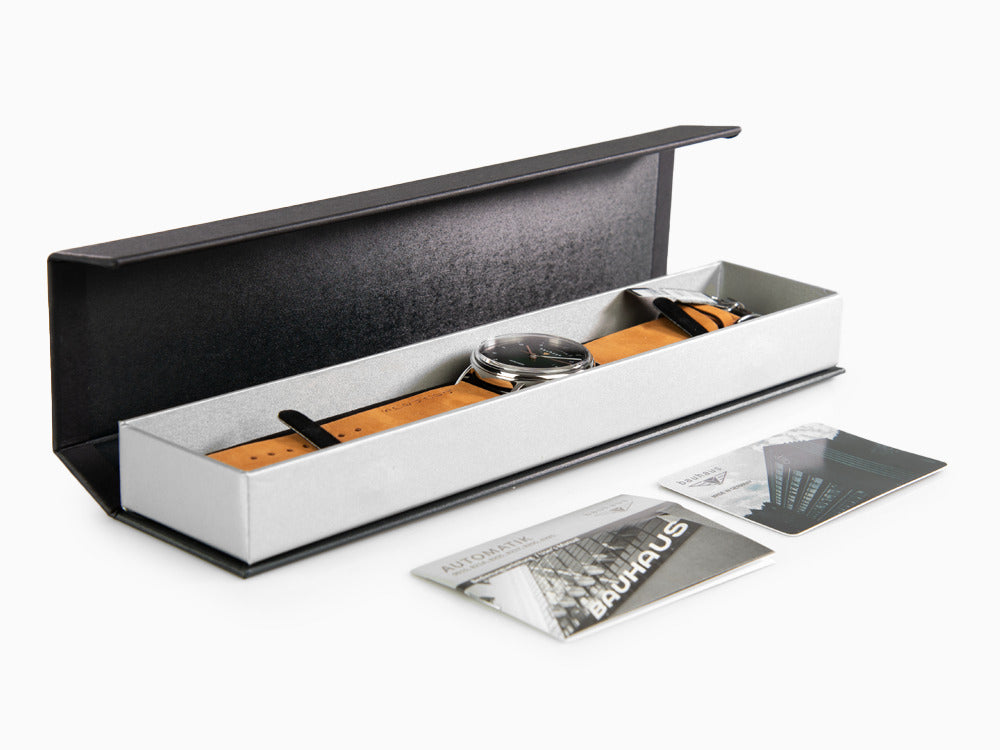 • Los relojes Bauhaus son un ejemplo de una funcionalidad elegante y moderna que se materializa en la reducción minimalista de las formas y los colores. Este reloj automático cuenta con un calibre 8285, una esfera con reflejos en verde oscuro que se reduce a lo esencial y una elegante correa de piel color marrón. Fabricado en Alemania.