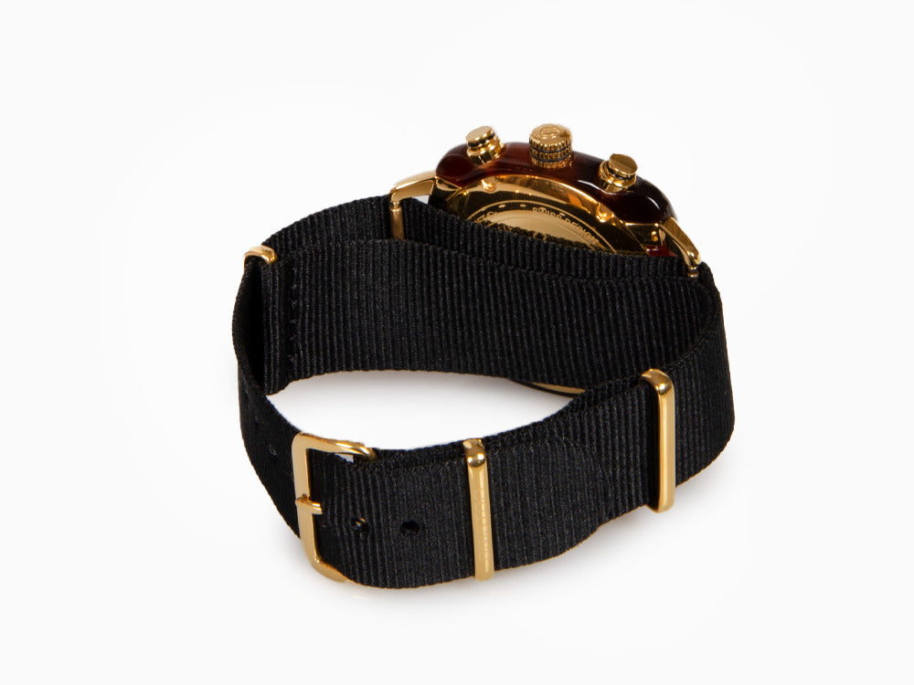 • El Clubmaster Classic nace de la unión de forma y material. Su forma en "cuadrado curvado" se inspira de los locos años veinte. Le da un aspecto de reloj único y clásico que se sale del estándar habitual de cajas redondas que encontramos en el mercado. Briston ofrece un reloj Clubmaster Classic Chronograph en acetato de celulosa que imita la concha de tortuga, esfera blanca y detalles en oro amarillo. Elegante y sofisticado, le acompañará tanto en sus reuniones de negocios como en sus salidas nocturnas.