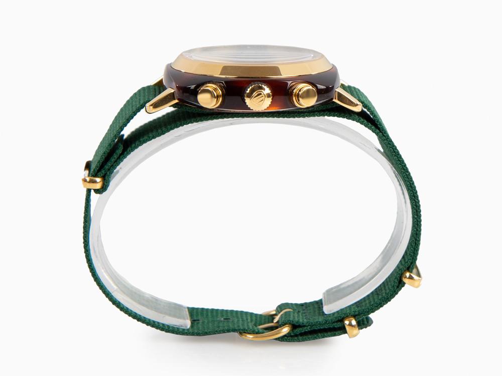 • El Clubmaster Classic nace de la unión de forma y material. Su forma en "cuadrado curvado" se inspira de los locos años veinte. Le da un aspecto de reloj único y clásico que se sale del estándar habitual de cajas redondas que encontramos en el mercado. Briston ofrece un reloj Clubmaster Classic Chronograph en acetato de celulosa que imita la concha de tortuga, esfera verde británica y detalles en oro amarillo. Elegante y sofisticado, le acompañará tanto en sus reuniones de negocios como en sus salidas nocturnas.