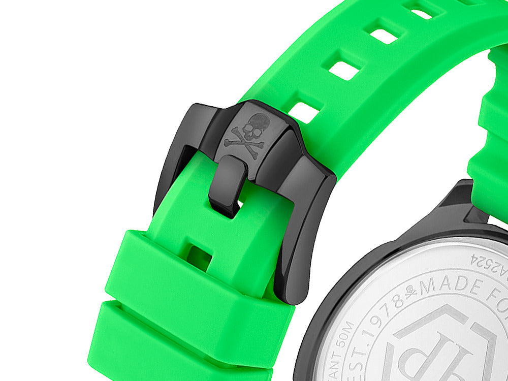 • Esta temporada Philipp Plein presenta su colección The Skull. Cada reloj demuestra que ningún desafío es demasiado grande y ningún objetivo es inalcanzable. La combinación de esfera color negra con detalles verde y correa de silicona color verde con detalles en negro dan el toque final. En la caja se ven grabadas el nombre de la marca y la colección.