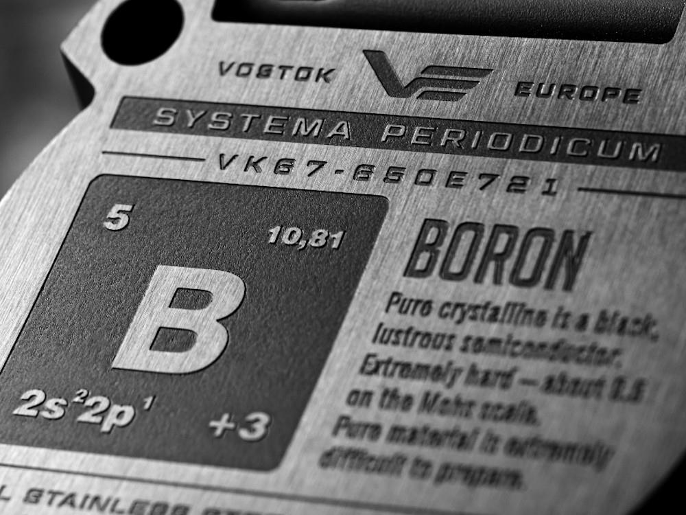 • Vostok Europe presenta su colección que se inspira en la tabla periódica de elementos químicos, organizando cada modelo de reloj en torno a un elemento específico del "Systema Periodicum". El Systema Periodicum Boron está dedicado al elemento de Boro (B): los cristales puros de este material rígido son de color negro. En la naturaleza, se encuentra combinado con oxígeno y otros elementos naturales, formando varios compuestos diferentes llamados boratos.